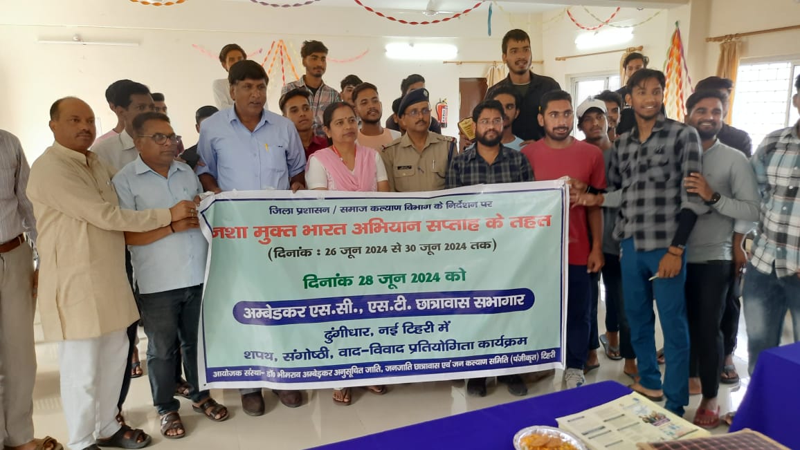 On June 28, 2024, as part of the Nashamukt Bharat Abhiyaan, a program was held on behalf of Ambedkar SC/ST Chhatrawas in New Tehri at the District Headquarter, Tehri. The event included an oath-taking ceremony, a conference, and a debate competition on drug addiction. The district social welfare, health department, police department, social workers, and students participated in this program.